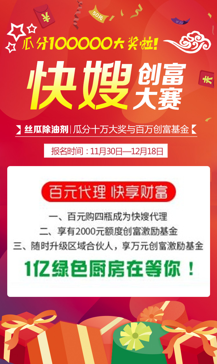 只需花100元购买4瓶快嫂丝瓜除油剂,便可享巨型一号快嫂创富大赛推出的三重利好:一是获得这款新爆品的代理资格,让你先赚钱后进货,二是享有2000元额度快嫂新电商创富激励基金扶持,三是凭销售业绩有机会瓜分快嫂创富大赛十万大奖。