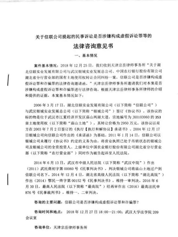 意见书指出:信联公司与银城公司在《协议书》《执行【执行和解协议】承诺书》《承诺函》中存在隐瞒标的物——庙山353亩土地真实权属(银城公司对该地块无使用权和处分权)的嫌疑。2000年6月16日,农行营业部将银城公司的资产打包剥离给长城武汉办,签订了《剥离收购不良资产协议书》,2004年9月21日,湖北高院作出【2004】鄂民二初字第25号《民事判决书》,确认该政策性资产剥离行为合法有效。依据国务院令第297号《金融资产管理公司条例》规定,该资产剥离的性质是政府指令性划转国有资产,属于政策性金融资产转让。即2000年6月长城武汉办已拥有庙山353亩土地中的162.81亩的使用权和处分权,庙山353亩土地中余下190.19亩的土地是南方证券出资1331.31万元共同投资。经(2001)武民初字第179号生效判决、(2004)武执证字第32号执行裁定及附件《债权实现记录》的确认,南方证券因该190.19亩地块对银城公司享有债权。2012年12月,南方证券公司破产,此时银城公司的营业执照已吊销五年多,故银城公司的全资投资人、上级主管单位农行营业部获得190.19亩的土地处分权。