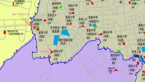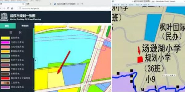 目前,汤逊湖小学原规划的教育用地现已变成住宅用地。比较《武汉市规划一张图》(左)、《武汉市都市发展区普通中小学布局规划图》(右)可以看到,原规划的汤逊湖小学教育用地的位置现已变成住宅用地(黄色部分为住宅用地)。