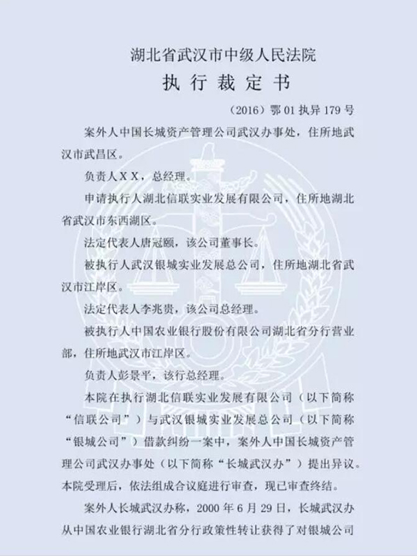 2000年6月16日,根据国家政策,银城公司资产被从中国农业银行湖北省分行营业部(以下简称“农行营业部”)剥离给中国长城资产管理公司武汉办(现更名为中国长城资产管理有限公司湖北分公司,以下简称“长城武汉办”)。