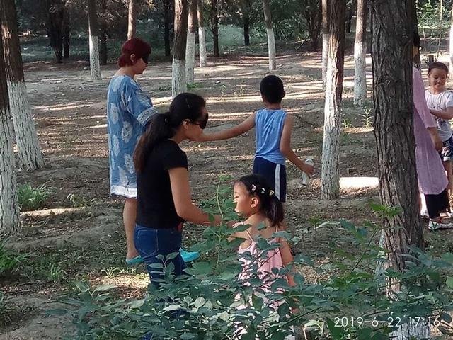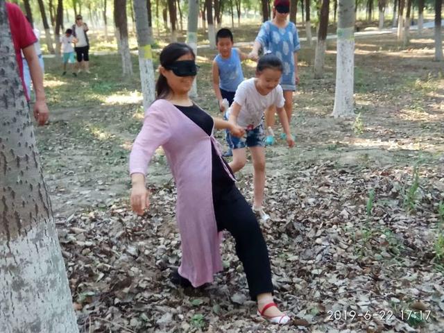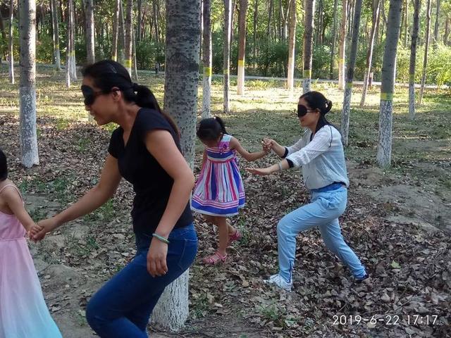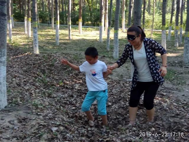 轮到我蒙的眼睛,被她带着走的时候,我就觉得眼前一黑,到处都是陷阱,步子都很难迈开。基本上都是用脚贴着地皮,一点点的蹭,不管她怎么安慰我,我都觉得前面就是树,前面就是坑。当然,打开眼罩之后,看到一个妈妈的嘴巴都磕破了撞到了树上,还有一个妈妈,被孩子带到了坑里,陷了一脚泥水。