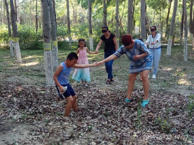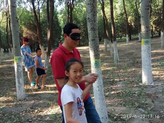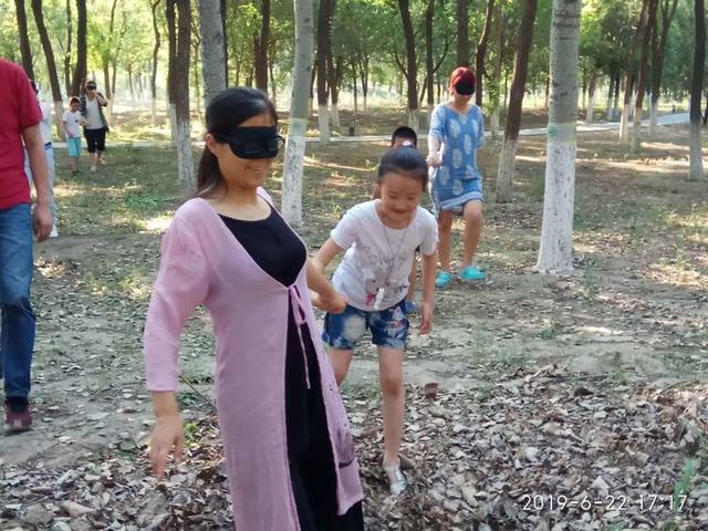 大人蒙上眼,孩子做向导。平时习惯了父母照顾孩子,今天让孩子来引领我们,在这样一个坑洼不平的树林里,每个家长需要用心的去感受我们的内心体验。我们是否放心把自己交给孩子?我们是否发自内心的信任她?面对眼前的黑暗和未知的前途,我们的感受如何?做为孩子我们是否能换位思考?能否耐心、细心的引领父母安全的到达目的地?