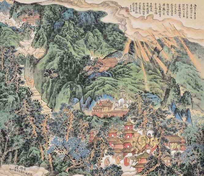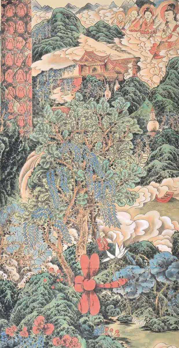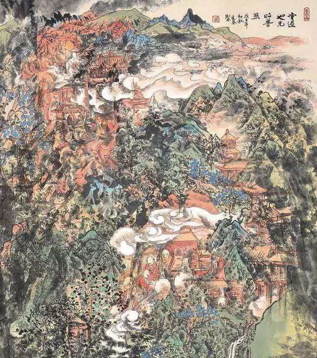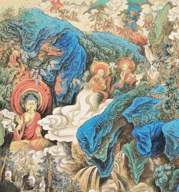 偶然间,他读到了佛经。有几部义理深奥的如《金刚经》、《心经》,他都未能深研理解,更无半点开悟。却被一篇《?行经》所感动。释迦的理想、誓愿及游行教化事迹,真实而朴素,令人敬仰。其思想、教义等更是充满了智慧,并具有原始的某种神秘感。心灵感应间,宫逢春的绘画题材,增加了此类内容。几年间他精绘释迦说法图多幅,却从不厌倦。在他心中,似乎已驻有了佛陀的灵光。在画中,便有了佛境,佛土的祥和、纯净和美好。这或许是逢春内心虚幻跃然纸上的一种写实体现吧?事实上,他在传统山水中借鉴技法,在历代壁画、雕刻中吸纳营养,他曾拜谒灵山宙宇,千年洞窟,五台圣境……一时作画中,竟不知是作画山水?还是为佛造像?就这样他在造境中感觉美好,对着臆造的佛陀,或菩萨形象净化着自己。或许这也是中国画的意象精神吧。?该不该坚守自己的虚幻?若与现实中所存的无尽的美比起来,它真是渺小,又渺茫。这个孽障,导致逢春几番思量,几番苦痛。面对大千世界的万般千种,宫逢春常常不能感觉到它的真、善、美,却总试图将实在的变为虚幻,将成熟变为童稚,将丰富的变为单纯。每当不能达到这念想时,便又有烦恼生出来。就是在如此执着的追求中,逢春迷而不悟,越陷越深,越画越深。