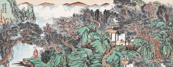 只见这幅画里苍松掩映的岩石,树叶深浅明暗各有变幻。村落、廊桥,隐匿其中,笔触精致。画中朱衣人,或流连于绿波,或休憩于小亭。都精心刻画了出来。美丽山河,奇峰怪石,山野人家,流觞曲水,视角全面,画法多变。确有“一步一景,咫尺有千里之趣。”