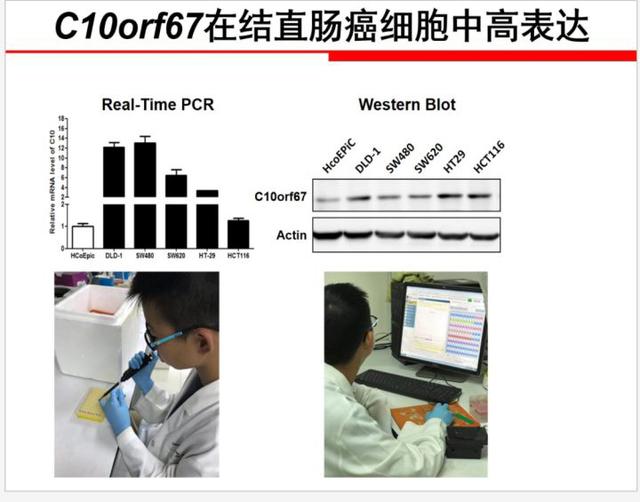 这是全国青少年科技创新大奖的获奖作品,小学6年级的陈同学凭借C10orf67 在结直肠癌发生发展中的功能与机制研究获奖,陈同学在三位老师的指导下,成功构建C10orf67基因,并通过细胞生物学,生物化学等多个方面对C10orf67在结肠癌中的发展做了分析。