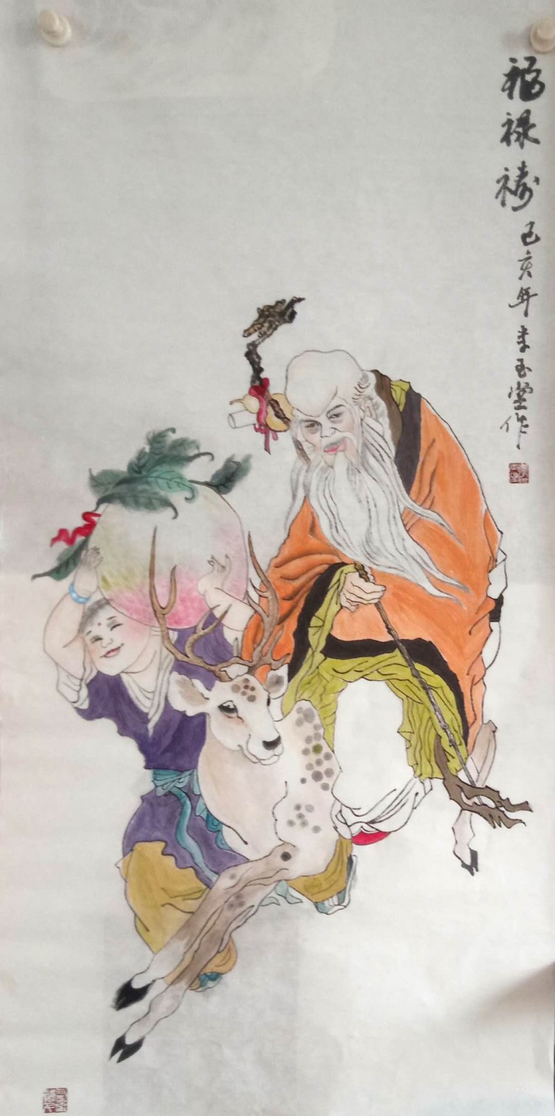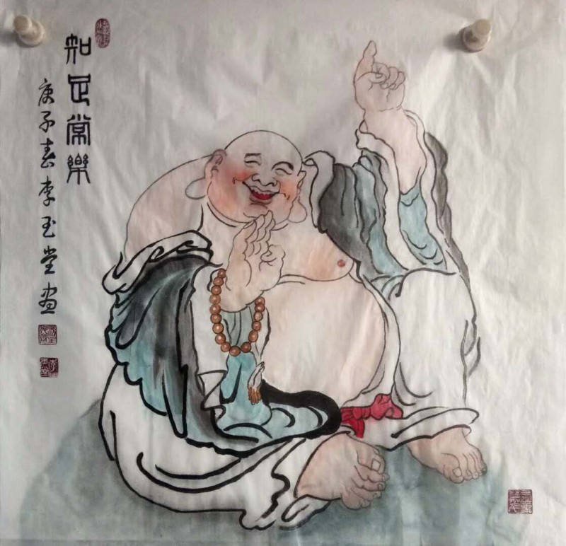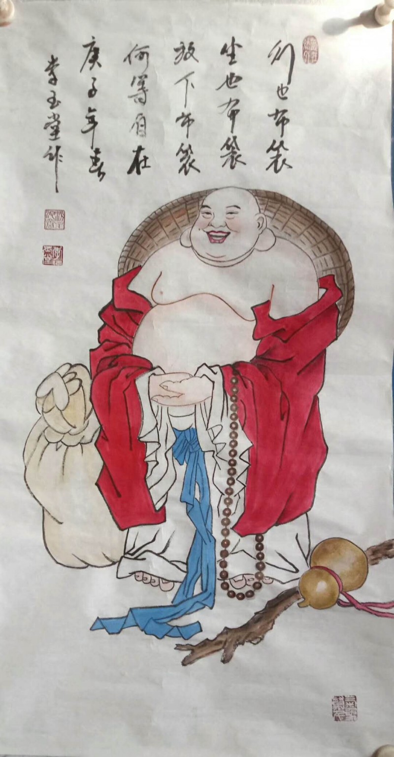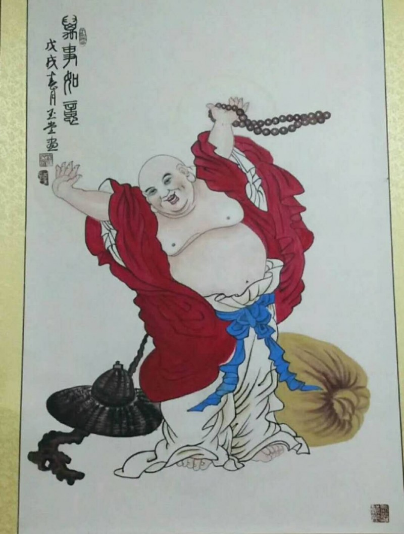 佛在中国的传统文化里是重要的角色之一。在民间画家李喜手中心里佛又是怎样的一种情怀呢?李喜的 代表作品《佛者福也》对佛作了这样的画面:他以一个大红的象形行书“佛”字作主体,“立”在画中心,又在佛字顶端两划之间,画了一个面向右上方看着两只谐音“福”字蝙蝠的佛首,以小写意技法,巧妙地表达主题。《达摩化缘》、《童子嬉戏》墨色丰富,造型传神,观者动容,李喜的民间绘画正步入一个高新的境界。