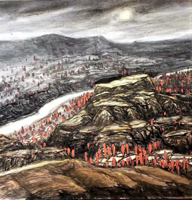 记者与东光青年时曾在神池县相识,对其作画尤为赏识。佛教圣地五台山似乎又给了东光不少灵气,于是他笔下的画颇有灵瑰,给人震撼或者触动。东光告诉记者,他家祖祖辈辈种地为生,生活的艰辛不言而喻。对于绘画,他没有可以炫耀的家学,完全出于对艺术的痴迷,才走上了这条艰辛之路。他接受美术的启蒙教育,还是从漆画匠人开始的。生活在农村,父辈信奉“天旱饿不死手艺人”。曾把他送去学木匠活,并帮雇主画漆画。就是在这样简单又重复的劳动中,他掌握了近乎原始的造型及色彩基础。当他厌倦民间手艺人那种绘老生常操的技巧后,心中竟萌动了用画笔表现家乡山水的冲动,并几经周折报考了中国书画函授大学,接受了最初的国画基础训练。