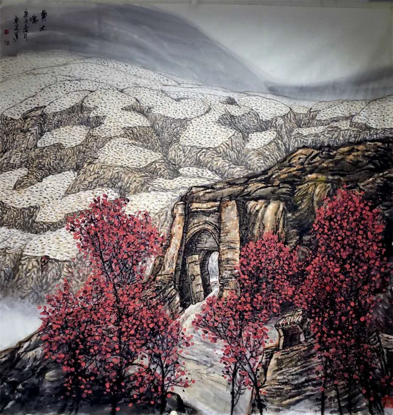 韩东光极力想用自己的方式记录,保留历史的遗存。或许是佛教圣地五台山的神秘滋养了他的心灵,也丰富了他的艺术语言,让他有了随性而发的可能。东光灵魂深处对生命轮回的理解,对美好和永恒的渴望都浓缩在画中,任凭想像的翅膀穿行在虚幻和现实之间。他尤其是醉心于对陕北黄土高原的描绘,他总是用最单调的色彩,最细腻的笔触来表现诠释高原的苍茫和荒凉,表达心灵深处受到的无法用语言表达的震撼。记者看到,韩东光的作品从表现手法来讲,韩东光不拘泥于单纯的写实或写意,而是让这两种手法服从于表现对象。细心勾勒处力求精细入微,明明白白告诉别人他要表达什么,肆意挥洒处又毫不在意具体物像的细节,在痛快淋漓中宣泄情感,张扬个性。构图的大胆是他作品的一大特色,但在继续和创新尺度的把握上也是他一直苦恼并一直寻求突破的难度课题。他总是在自己的想法和别人的接受过程中权衡,最终他给自己作品的构图设立了一个原则,即均匀但不呆板,破形但不破境,重叠但不重复,夸张但不扭曲。事实上谁也很难讲清楚韩东光他是否做到了这一点,但韩东光的绘画创作毕竟是一个无法设定程式的劳动。