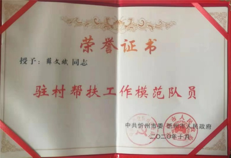 为人民服务在90后薛文斌身上得到了真实的体现,无论是他接触的农民,还是他所在单位的领导同事,均有口皆碑。这个后生懂事能干,务实勤快,是上上下下对他的普遍印象。2020年10月他被中共忻州市委、忻州市人民政府评为全市驻村帮扶工作模范队员。
