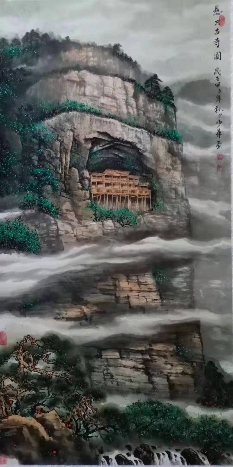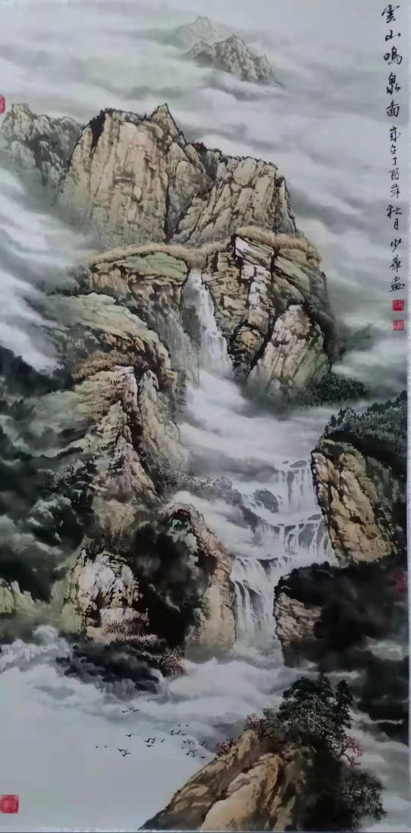 画如人生?人生如画?对此,少华认为国画画艺,前者应以艺德修,人品贯穿画品。绘画惟妙惟肖是审美的一部分,但更多的是看一幅画表现给人的意境是否高远?气势之大是否气壮山河?少华的国画则以深厚的文化作为积淀,即是承古,又在创新。他以不脱离传统,又可以接新的姿态来画,既要“形似”,又讲求“神似”。绘画的关键不在于对象的美与丑,重在“画龙点睛”之笔,表达出事物的内在本质精、气、神。少华的国画,多是一幅幅完整的山水画面,空灵的意境,让人产生某种情思畅想的空间。