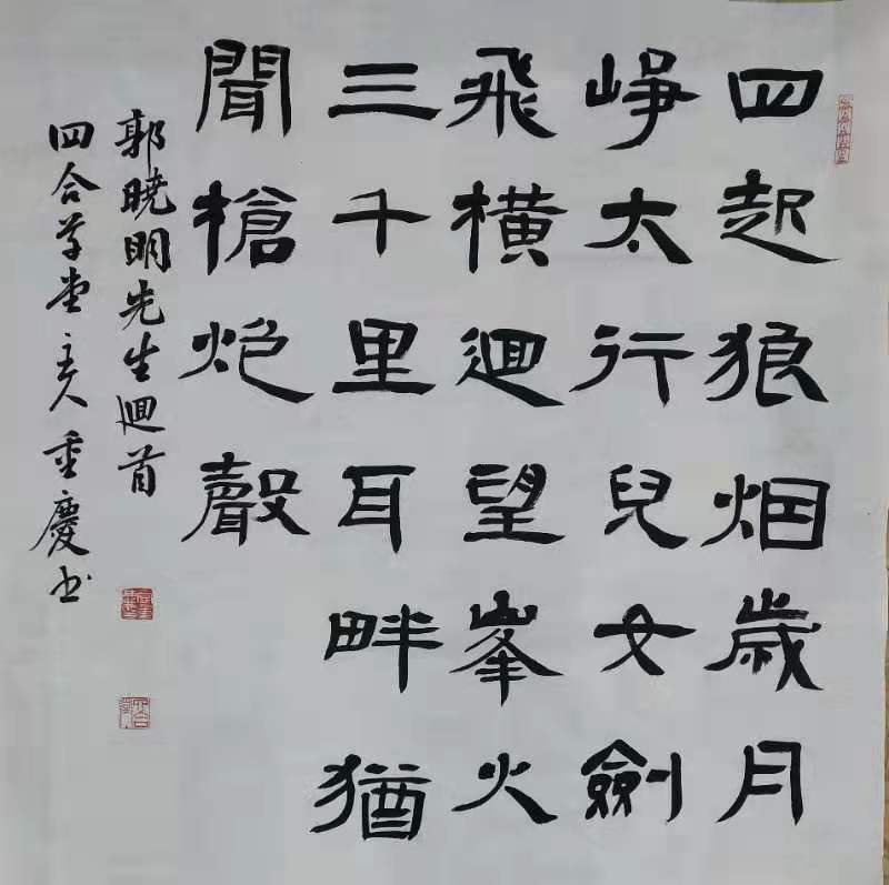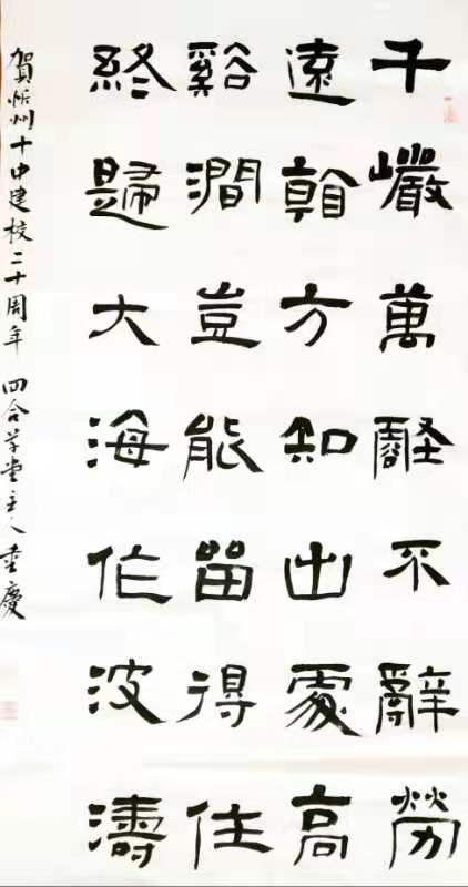 李重庆楷、隶、篆等书体兼容,他的楷书筋骨挺允,骨肉相济,灵动活泼,笔法自然。其用笔变化、章法辉映、错落有致,呼之欲出。他的隶书、篆书,融进楷书的疏密????瓜咛跣性屏魉??嬲?/span>自如,结构合度,方圆疏密、粗细浓淡、可谓珠联璧合,雅趣横生。