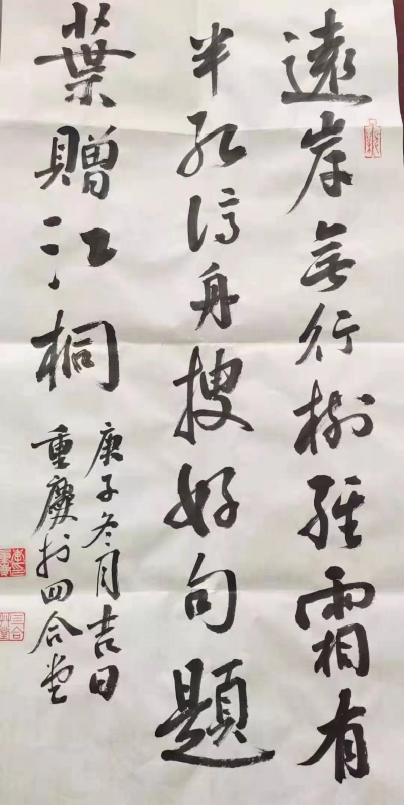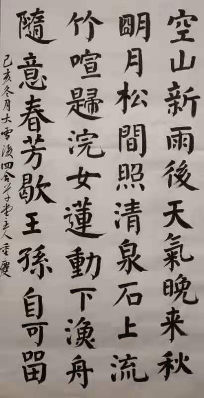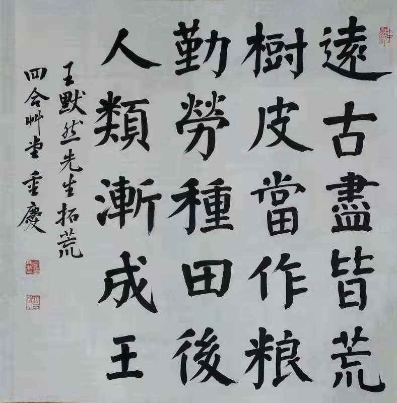 纵观李重庆的书法作品,法度严谨,布局规整,字体端庄,线条遒劲,点画灵动,清新不单薄薄,隽逸不妍媚,厚重不僵滞。尤其是骨力通达,潇洒飘逸,鸿篇巨制,或雍容典雅,或盈尺小品。他师古,非泥古不化,非陈陈相因。求新,非脱离本源,不以丑为美。实为“集古人之长于己心,拢百家之法融一体,予己心,予己笔”。放笔直取,挥洒有度,观之舒服。