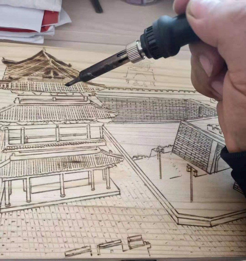 宣纸烙画他十分拿手,但此技对烙画技术和绘画功底要求非常高。他说,宣纸烙画在创作时侯要做到意在笔先,每一笔都要准确到位。画的时候烙铁用300瓦—400瓦电量之间的温度,在0.1毫米的宣纸上烫画,稍有犹豫就会烫穿宣纸,所以宣纸烙画是对烙画者技术和功底的考验。