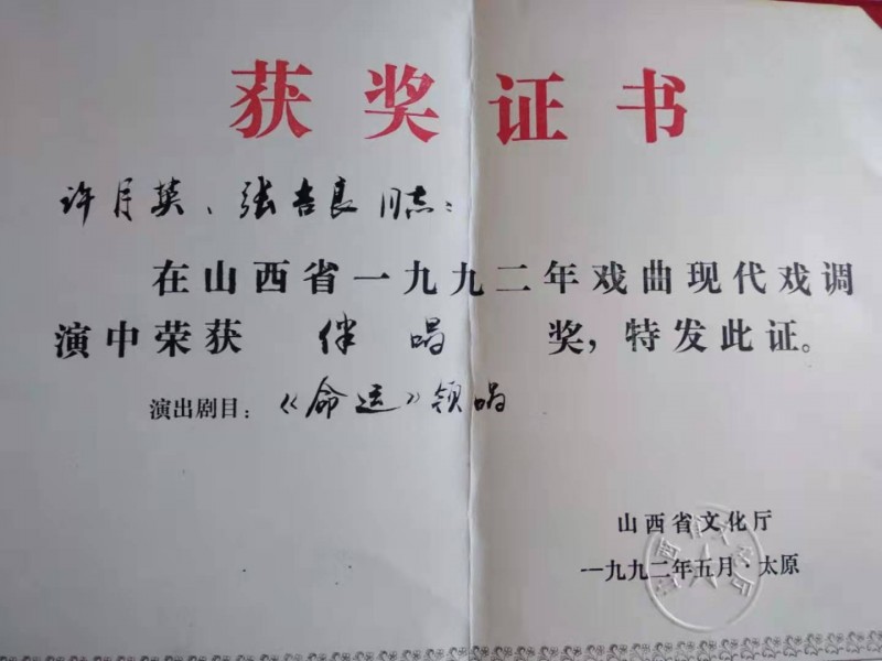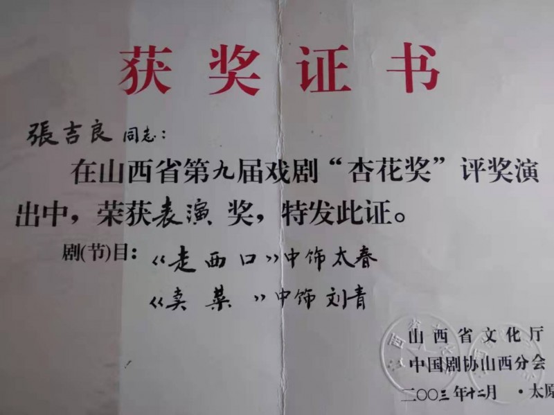 他说自己这辈子就是个专唱民歌,走西口的汉子,他个人独唱“走西口”曾获得忻州市民族民间艺术节“一等奖”、晋、蒙、陕、冀二人台电视大奖赛“优秀奖”。和我团梁美琴搭档在中国戏曲红梅荟萃山西选拨赛中获银奖。和詹丽华合作在山西省第九届“杏花奖”中获得省政府最高奖“杏花奖”。