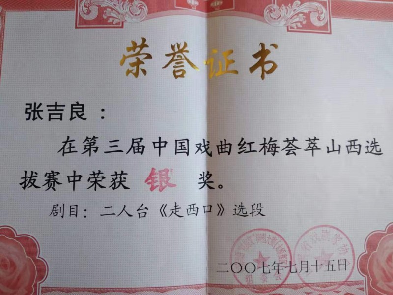 2011年演唱《山西牧歌》参加全国爱我中华歌手比赛获优秀奖。2003年以一首用二人台《走西口》改编的歌曲《走西口的哥哥》参加忻州市民族民间调演受到评审专家一致好评获得忻州市委宣传部忻州市文化局评为“一等奖”。同年省政府把过去2年一届的前8届戏剧杏花奖只能戏剧参加改定为从第九届省政府最高奖“杏花”奖。参评剧(节)目涵盖戏曲、歌舞剧、话剧、小品、曲艺、声乐、器乐、舞蹈、和杂技9个艺术门类都可参加。张吉良报名参加比赛他和著名演员詹丽华共同合作,由李金兰老师执导,他的老师二人台著名表演艺术家许月英唱腔指导,精心排练二人台《走西口》《卖菜》。这次评比演出共组台33台,有近3000演员参加了演出活动,共162个剧(节)目,全省有325人参加角逐,参演人员之众,演出台数之多,参评剧(节)目之丰富,剧种之全,参赛难度之大,堪称山西历次评比演出之最。全省原初参赛的剧目共528个,经过复赛减到了295个,专家审查222个,最终评审确定下来参赛剧(节)目共162个。他和詹丽华报名参演的二人台《走西口》、《卖菜》经过层层筛选比赛,最后在省城一炮打响,轰动省城。