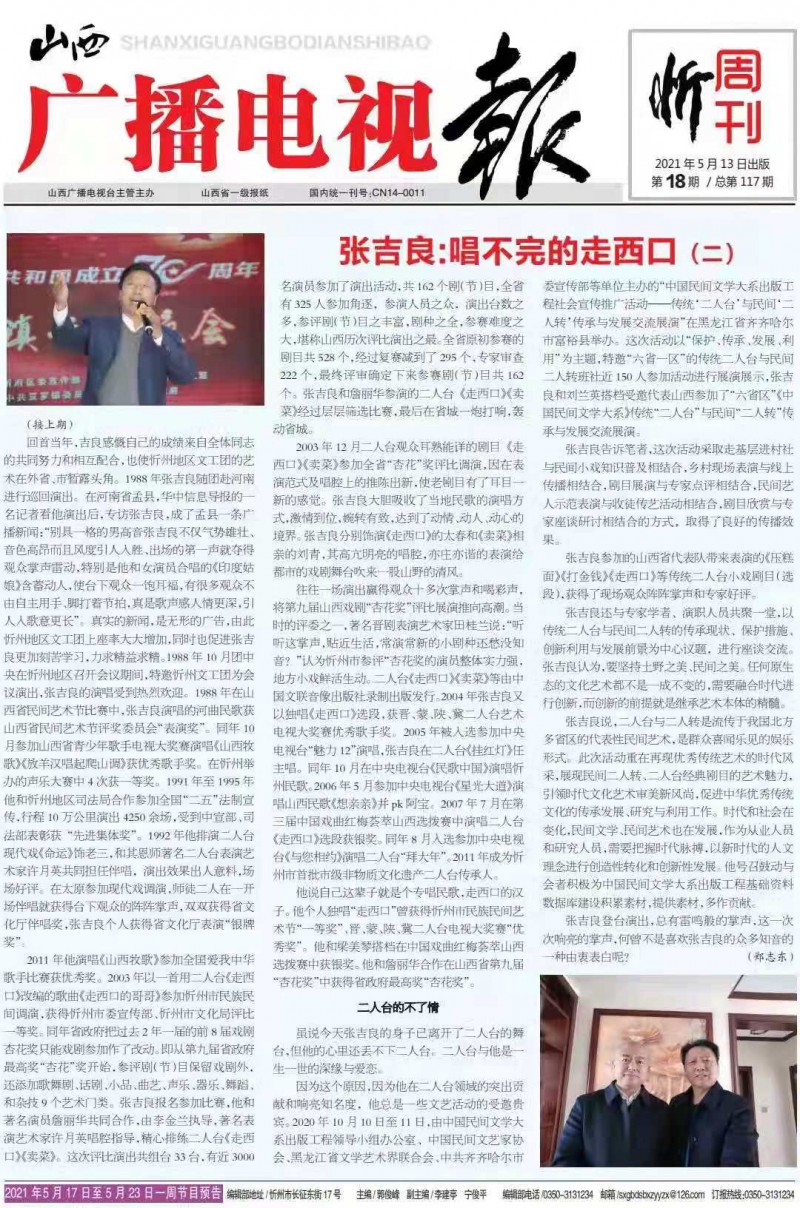 因为这个原因,因为他在二人台领域的突出贡献和响亮知名度。2020年10月10日至11日,由中国民间文学大系出版工程领导小组办公室、中国民间文艺家协会、黑龙江省文学艺术界联合会、中共齐齐哈尔市委宣传部等单位主办的“中国民间文学大系出版工程社会宣传推广活动——传统‘二人台’与民间‘二人转’传承与发展交流展演”在黑龙江省齐齐哈尔市富裕县举办。这次活动以“保护、传承、发展、利用”为主题,特邀“六省一区”的传统二人台与民间二人转班社近150人参加活动进行展演展示,张吉良和刘兰英搭档受邀代表山西参加了“六省区”《中国民间文学大系》传统“二人台”与民间“二人转”传承与发展交流展演。