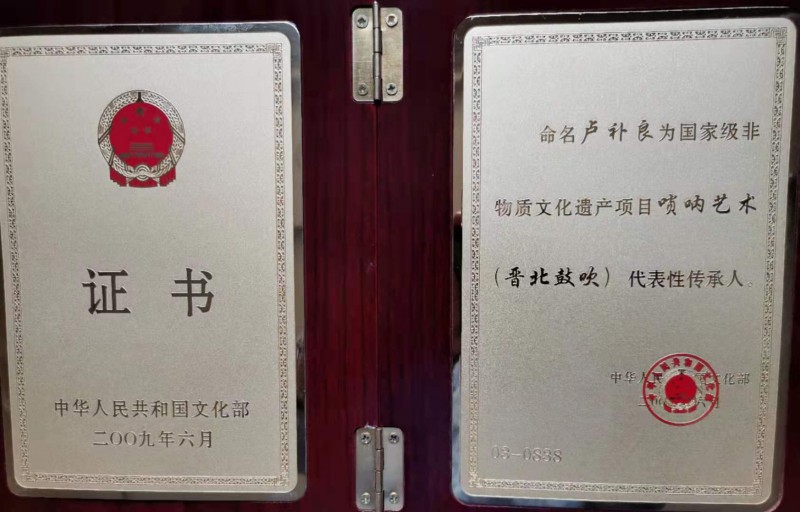 特别是“晋北鼓吹”入选国家级非物质文化遗产名录,2009年卢补良成为国家级非物质文化遗产“晋北鼓吹”唢呐艺术代表性传承人后,他越发成了大忙人。“晋北鼓吹”非遗传承工作也干得风生水起,各种演出活动应接不暇,各种荣誉也接踵而来。