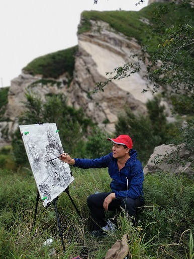 各种艺术总是相通的,而画理原本一致。何况同一门类的绘画,更是俱有“你中有我,我中有你”的内在联系。早年积淀的水粉画基础为张吉玉学习山水画提供了厚实的底子,让他在尝试新实践之中有一种触类旁通的感觉。当然,他更懂得“万丈高楼平地起,夯实基础最重要”的道理,为此经常相约或跟随画友到野外写生,冬不畏严寒之冷,夏不避酷暑之热,不仅跑遍了周围的天涯山、滹沱河、于家沟、奎光岭等,还多次远赴外地采风,常常弄得自己土一身,汗一身,泥一身,不惜风尘仆仆。仅偏关的老牛湾一处,他就前前后后去过三次之多。有时,赶上其他友人不太方便,他宁可承受孤独寂寞,也会毅然出行,在荒郊野外一坐就是数个小时。年初春寒料峭,张吉玉再次独往独来于云中山麓,把那里的奇峰、怪石、古松一处处搬上画板,移到纸张,以作为日后开展创作的生动素材。因受寒气侵袭,他竟染上了重感冒,折腾半月才得以康复,但为了画画,他认了。多年相处的好友吕泽评价吉玉说,用心者终要成。