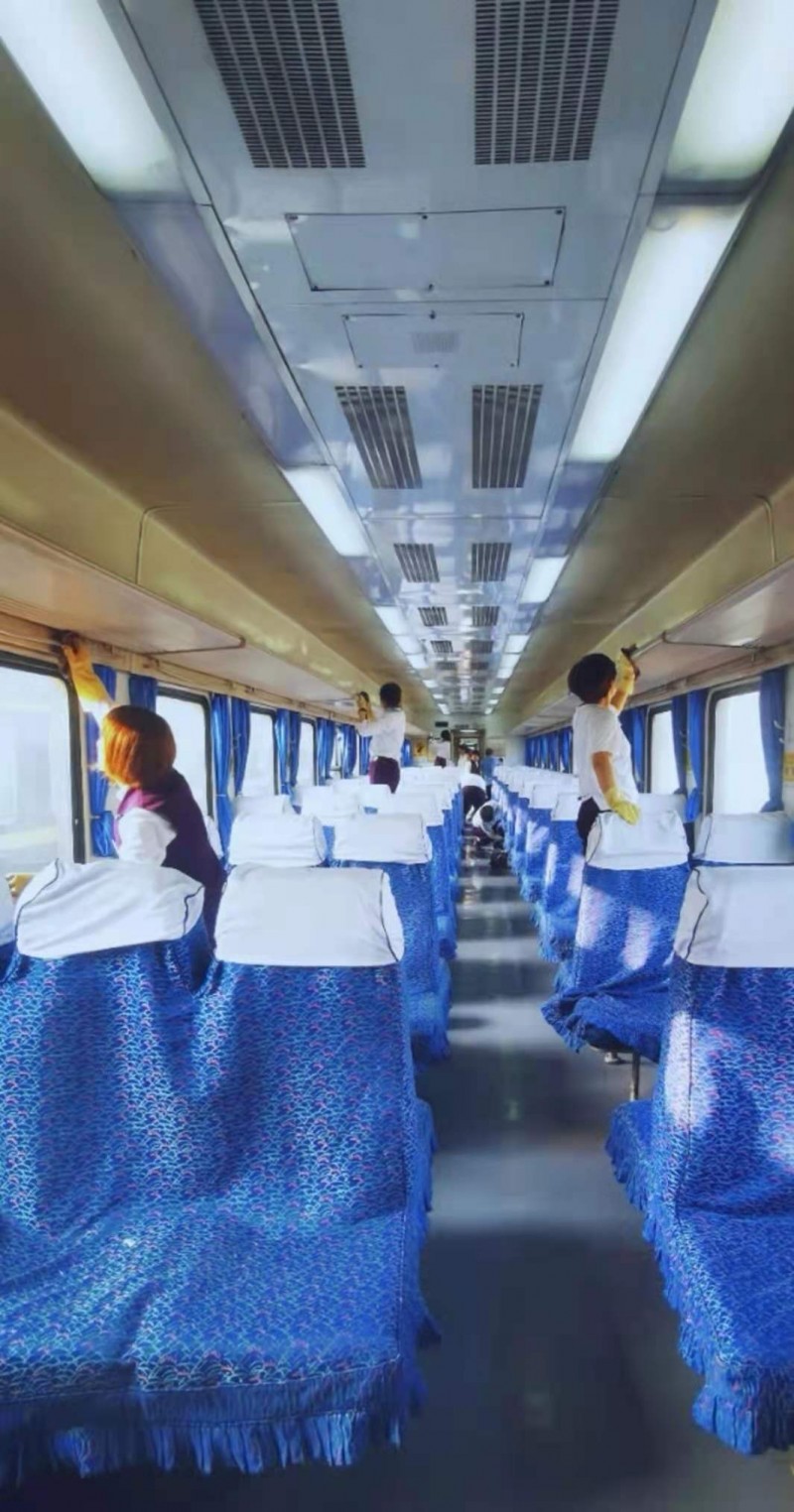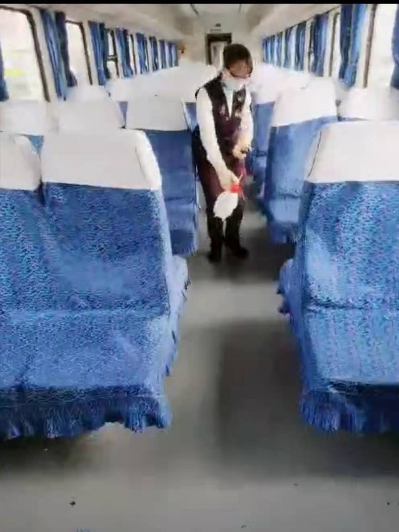 面对严峻的疫情,为了确保旅客有安全的乘车环境,班组在旅客上车前对车厢各个角落进行卫生清理,列车长亲自对车厢进行全方位的消毒,确保旅客及工作人员的零感染。