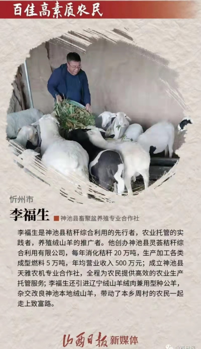 说李福生是个高素质的农民,名不虚传,他在乡村振兴中,确实做出了贡献,他以自己的高素质影响更多的农民提高素质,在当地逐步形成“培育一人、致富一家、带动一片”的地域性农民创业兴业的良好局面,功劳不小。他是神池县秸秆综合利用的先行者,他是神池县农业托管的实践者,他是神池县养殖绒山羊的推广者。