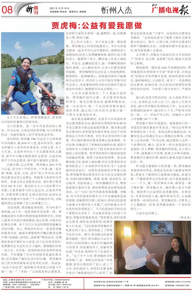 志愿志愿,志之所愿。贾虎梅从2012年参与公益,至今快十年的历史。十年来,她一直本着“奉献、友爱、互助、进步”的工作宗旨,投身到志愿者这项公益事业,积极参与各种形式多样的、有意义的义务服务活动,每年累计服务时间260多小时,做过的大大小小的好事不计其数,凡是有她参与的公益活动,总是有声有色,在服务群众需求,弘扬互助风尚,促进社会精神文明建设中发挥了个人积极的作用,为构建和谐社会奉献了自己的绵薄之力。。