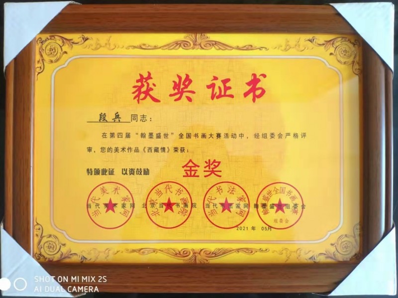 作品在参加2021年“艺术畅想杯”全国书画印艺术大赛中绘画荣获银奖,作品同时被画院收藏。