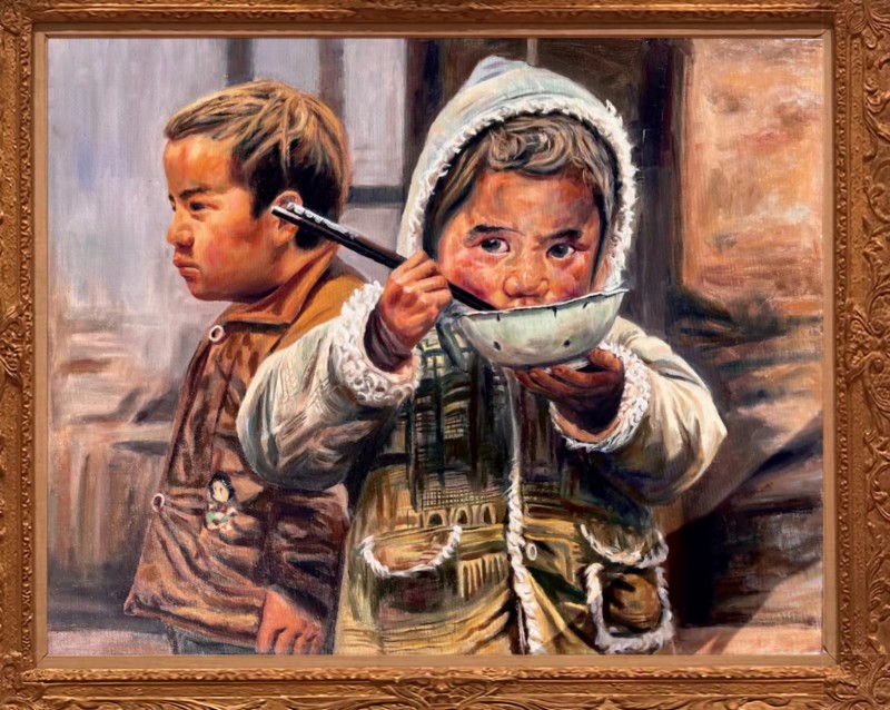 《归途》作品里人物形象各有特色。画正面的俩个小孩子眼睛里透露出空灵的感觉,非常动人,而老人一看就是经历过岁月的洗礼,相当感人。这种感觉段兵是怎么做出来的呢?
