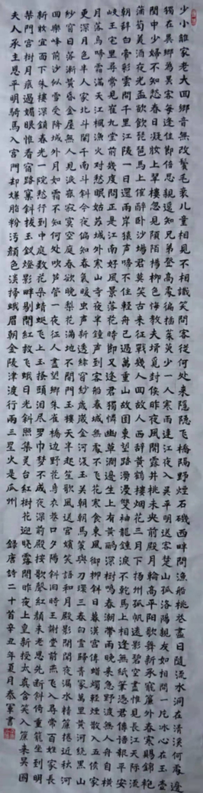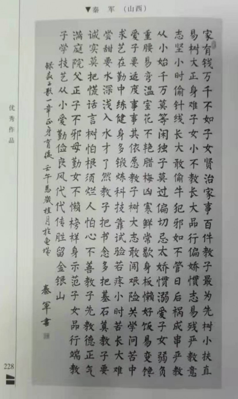 秦军书读多遍,其义自解。他说,有人专于行草,有的长于楷隶,有的长于篆籀,可以信念“博涉多优(孙过庭语),但也不妨自守“专工”。孙过庭曾批评“专工小劣”而称赞“博涉多优”, 但这绝不是绝对的。君不见有不少“博涉而不多优”的,也有不少“专工”而优的。秦军是“专工而优”的一个例子。他的心性才情在于楷隶,而似不在行草,所以他安此本份,安此根抵,才会有此成就,否则以己之短,求人求长则又何如?为艺之人定力可贵。这是一个“放任”,而不欣赏规范的时代。但是秦军的楷体法度美是一种经典。无论你如何放逸,经典总是不会湮灭的。草书的行云流水奔放不羁固然可贵,而楷法的端严整肃也自有一种方正挺拔的美,不可取代。因此,颜柳欧赵同样辉映青史。