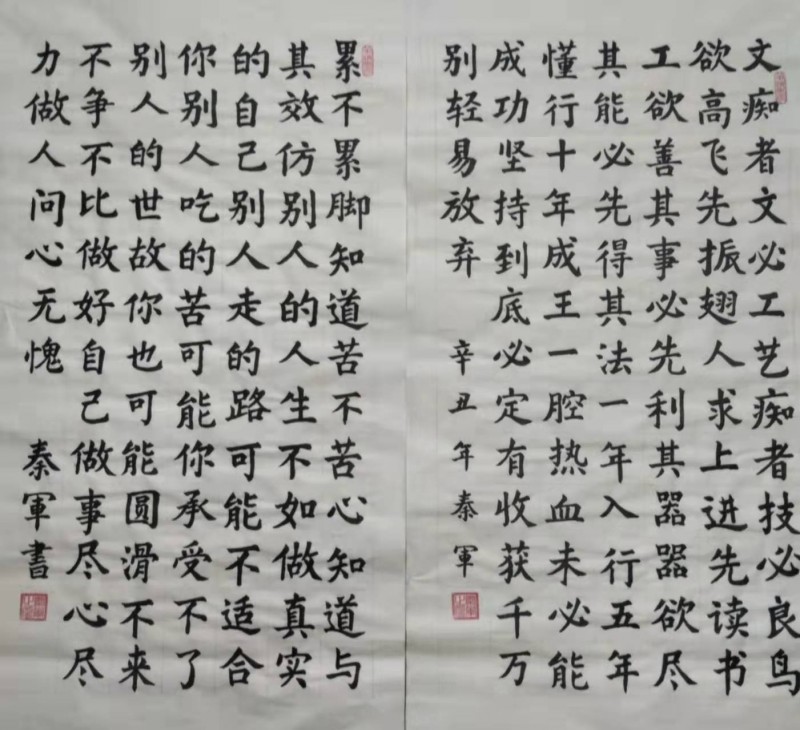 秦军写字十分认真,就如他为人一样踏实耿直。他学书从不走捷经,他从柳公权楷书学起,临习柳公权《玄秘塔》《神策军碑》,感悟到楷书不仅是现代汉字中的正式字体,也是当今书法艺术中的重要载体。他认为,不管是从实用的角度,还是从书艺的角度看,学好楷书都具有重要的意义。他说,唐楷之所以历经千年仍被大家一致推崇,凭借的正是严谨的法度和精到的用笔。史称柳公权用笔,讲究“心正则笔正”。历代书法家都持有这样一个观点,字如其人,书为心画。他们认为一个人的书法水平好坏和一个人的人品、道德、学识、涵养是密切相联系的。而书写者要获得比较好的艺术效果和艺术水平,就必须要有良好的道德素质,用道德素质来反哺艺术水平。他始终坚信:不论从做学问,还是从学书的角度讲,第一步当然是选择楷书,俗话讲“楷书如立、行书如走,草书如跑”。不能站立,岂能学跑?立是静止的,“站有站相,坐有坐相”是起码的要求。学书从楷书始、从点画始,就是为了先学成规矩。