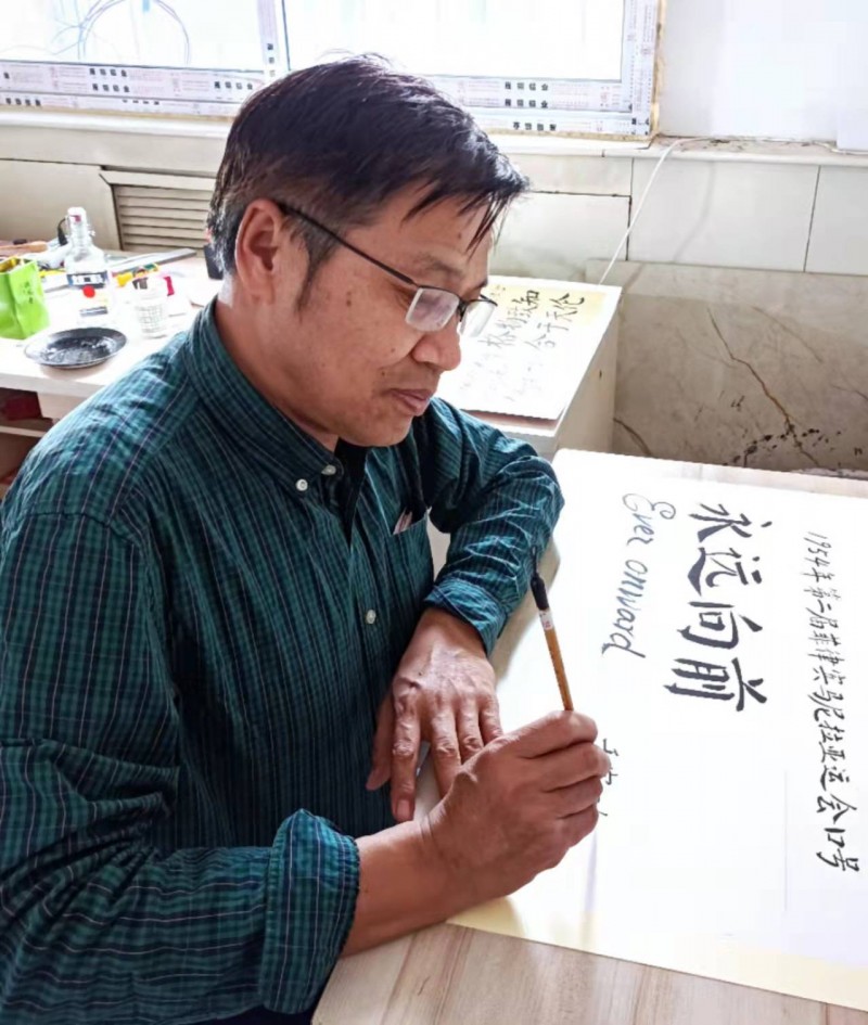 一尔幽默风趣地说顶层设计就是顶天立地,人民至上,致敬人民,给大众写,为全世界人服务,那就是顶天立地很大的市场。 据了解,人民日报和新华社2021年又在云南国际会议上推出了双语书法,冬奥会也有毛主席《沁园春·雪》的双语书法。接棒冬奥,冲刺亚运。举世瞩目的北京冬奥会落下帷幕,杭州亚运会也进入了倒计时不到200天的时间,眼下,一尔又开始精心策划系列历届亚运会口号的双语书法,并得到迎亚运书画大赛组委会工作人员的认可。