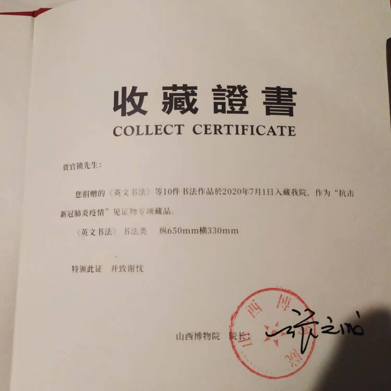 国内的国际活动自然体现中英文,地方与国际关联的人和事也需要中英文,文化搭桥促进中外友谊。在各地抗疫活动、山西旅发大会、原平果商大会等活动中,一尔先后赠出300多条双语书法。仅官方出具证书证明接受捐赠的就有两百多条,求购双语书法者很多。浙江义乌一个策划英语扑克牌生产和出口原平炕围画的富商,在了解到一尔的双语书法后,专程登门找到一尔就中西文化包装请教策划。