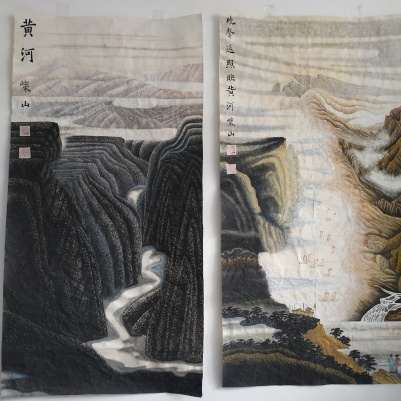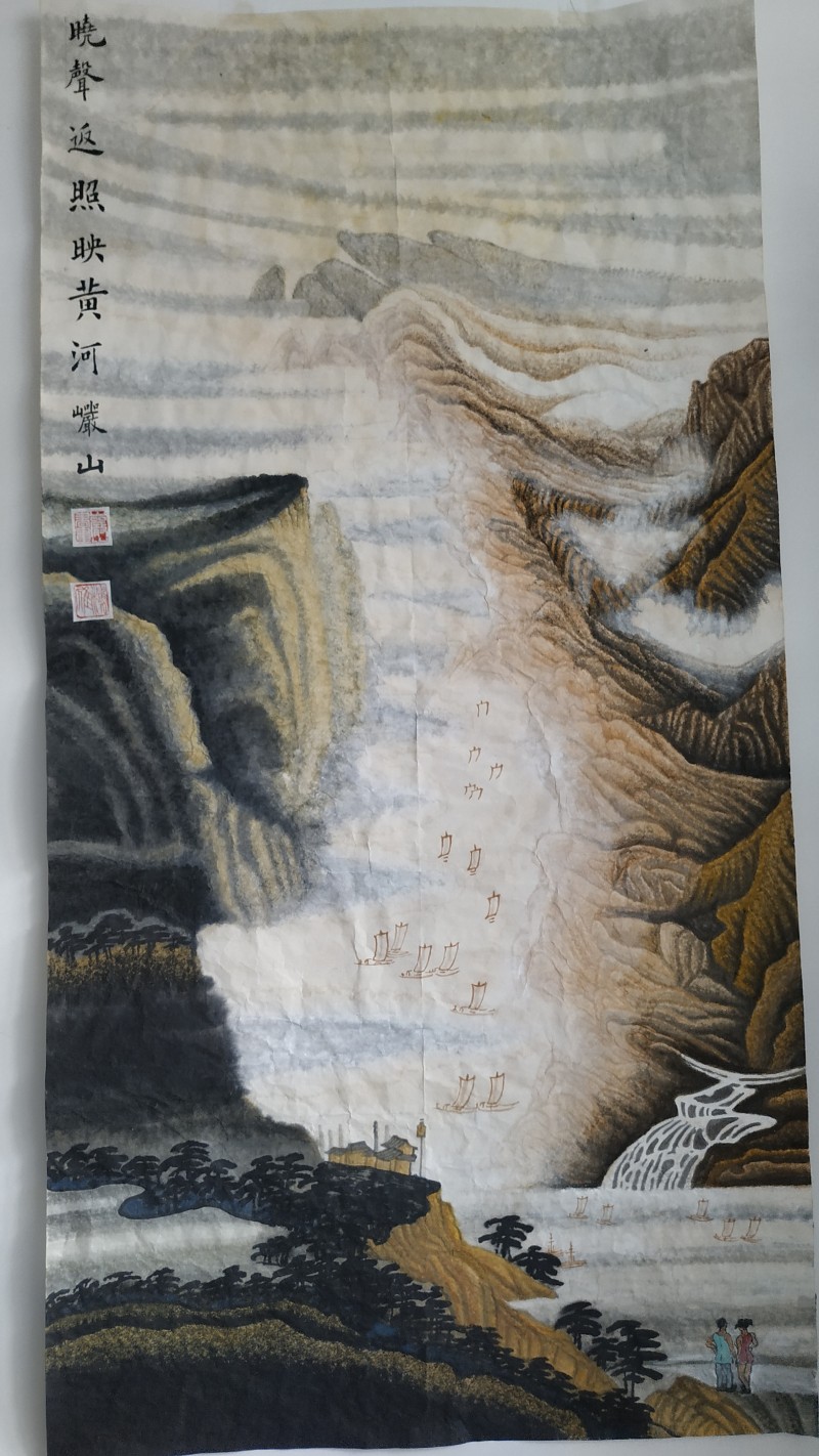 走近兰岩山居室,客厅里别具一格的《黄河系列》点??画让笔者耳目一新。更为奇妙的是,这些画,都是兰岩山在作画前把好宣纸揉搓成团后,在展开分层次点的,立体地显示了山势的远近,展现了母亲河的风采,画风妙不可言。兰岩山说,点??就是画家随意点染,用点和染的笔法以描绘物象的画法,是中国画技法中的一种,出自《闻见偶录·没骨画》。其技法是用毛笔,蘸好色墨后,或中锋或侧锋,或中侧结合,点出物象,不用描法勾勒,只用不同色相、浓淡的颜色,以概括洗练的笔法,随笔点染,以成物象。强调笔锋要藏而不露,横行“无往不复”,竖行“无垂不缩”,古人称之为“一波三折”,画出的线条沉着含蓄,力透纸背。“疏可跑马,密不透风。”能收到似不经意而饶有生趣的效果。