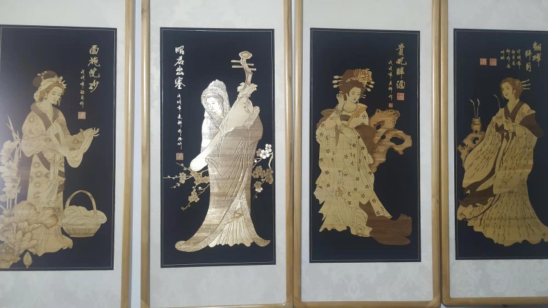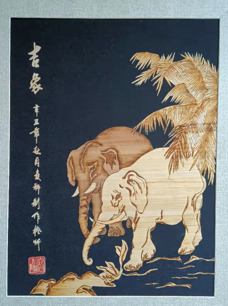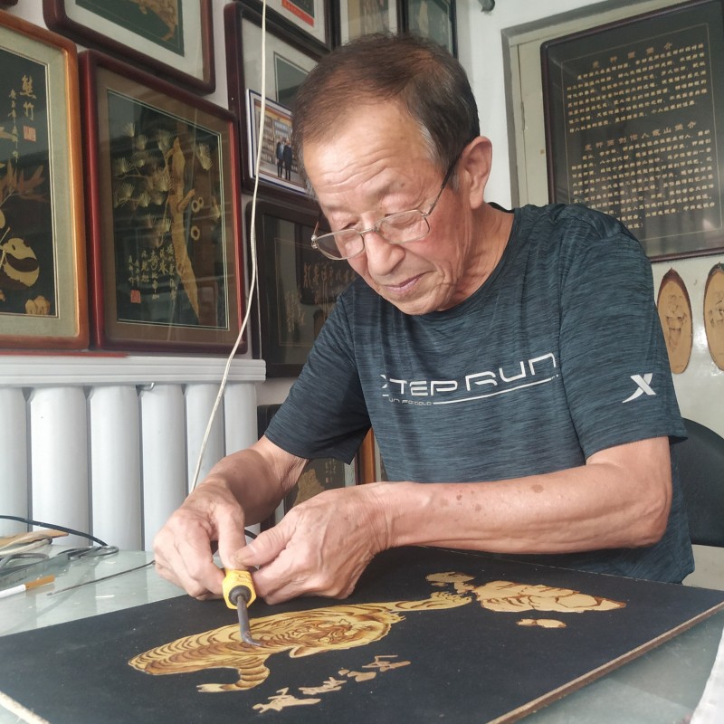 一切皆在规律中。寇山选定画样后,在蒙一张拷贝纸临摹勾勒,把处理好的秸片用乳胶一条紧贴一条横粘在拷贝纸上,拿电烙铁熨平。然后用手术刀、剪刀、镊子、熨斗、电烙铁熨烫。烫出花草脉络、人物肖像、山恋层次……他力求层次清晰、透视合理、光感自然,让人赏心悦目。