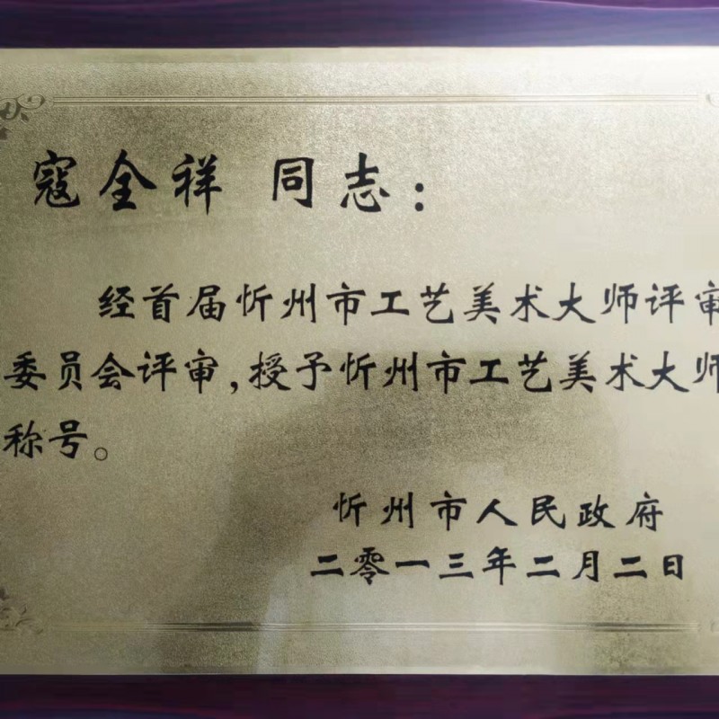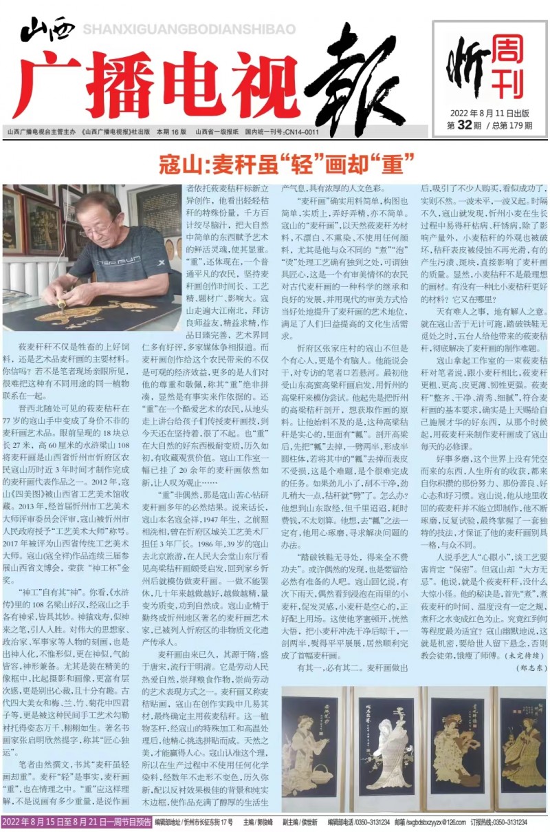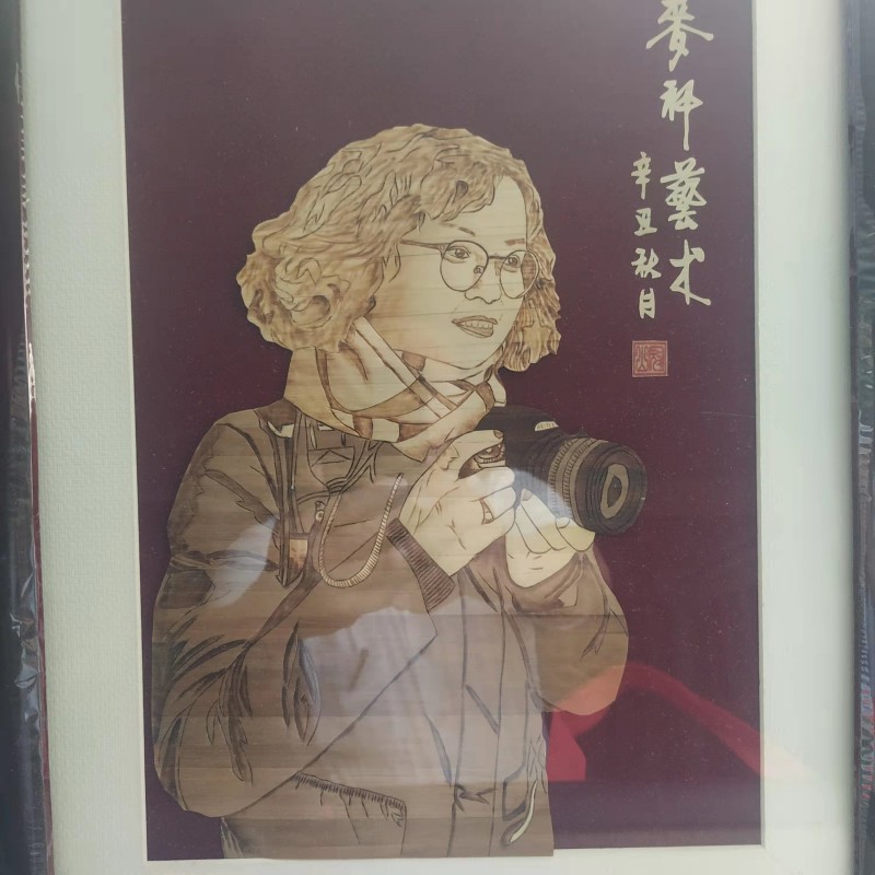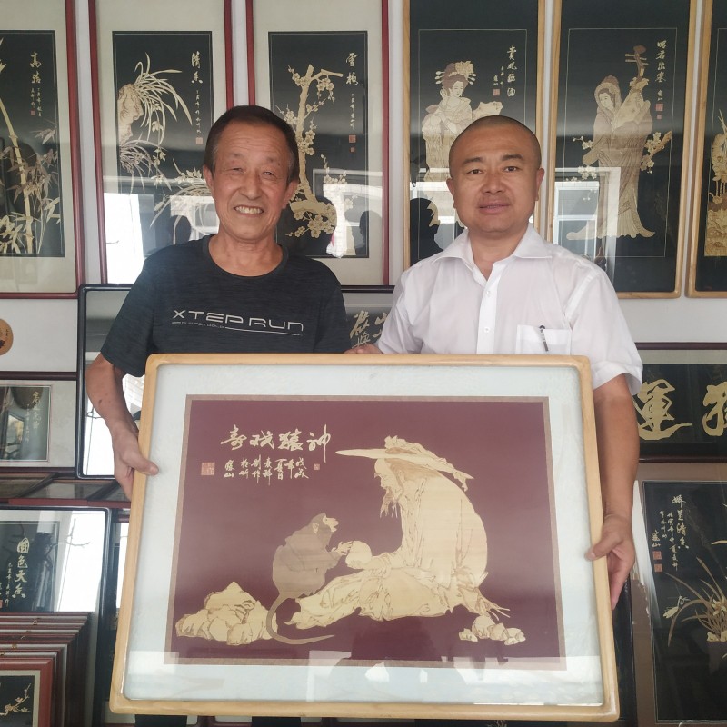 “重”非偶然,那是寇山苦心钻研麦秆字画多年的必然结果。说来话长,寇山本名寇全祥,1947年生,从前照相洗相,曾在忻府区城关工艺美术厂担任3年厂长。1986年,39岁的寇山去北京旅游,在人民大会堂山东厅看见高梁秸秆画颇受启发,回来家乡忻州后就模仿做麦秆画。一做不能罢休,几十年来越做越好,越做越精,量变质变,功到自然成,好运伴随行。寇山业精于勤终成忻州地面上的麦秆画著名艺术家,列入忻府区的非物质文化遗产传承人。说起寇山的麦秸秆画,的确在当地的书画圈子中大名鼎鼎。