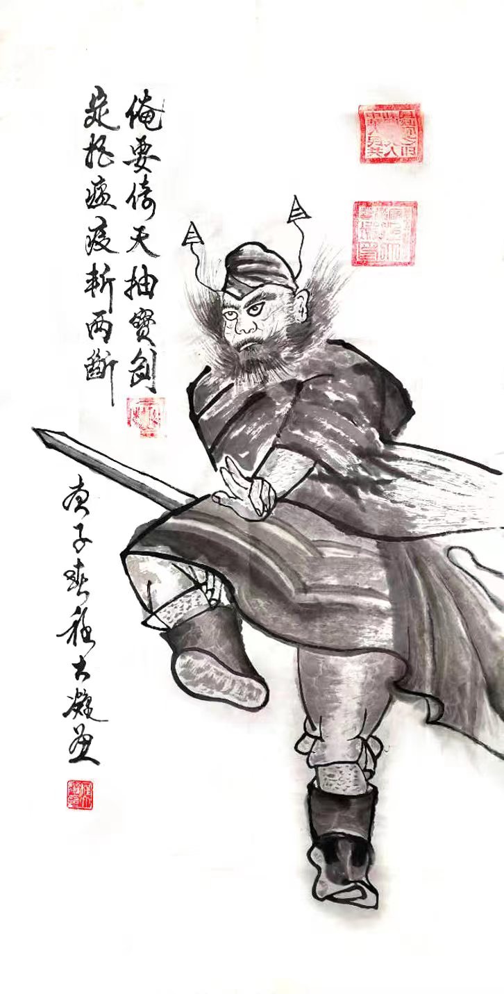 程大凝先生表示,疫情反复,仍然严峻,自己的家乡忻州也成重灾区。责任担当使他奋笔书画,以书画文化特有的“软力量”来彰显战疫的“硬斗志”。“俺要倚天抽宝剑,定把瘟疫斩两断”的钟馗画作颇具有神采;十八种由程大凝独创的书体条幅,流露出对疫情的深恶痛绝。人们目睹程大凝的字画,油然而生无穷斗志。