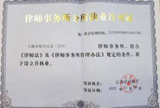 入驻苏州,海华永泰律师事务所在长三角地区再迈出重要一步!2022年11月3日,经江苏省司法厅批准并颁发许可证,上海市海华永泰(苏州)律师事务所正式成立。