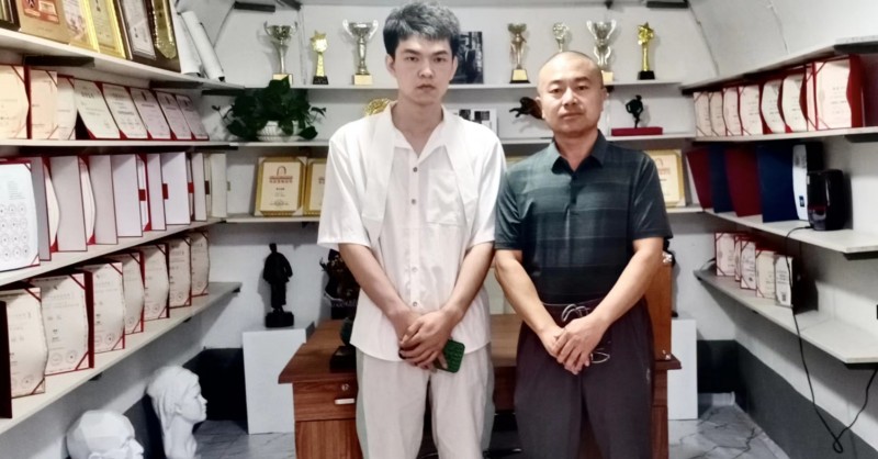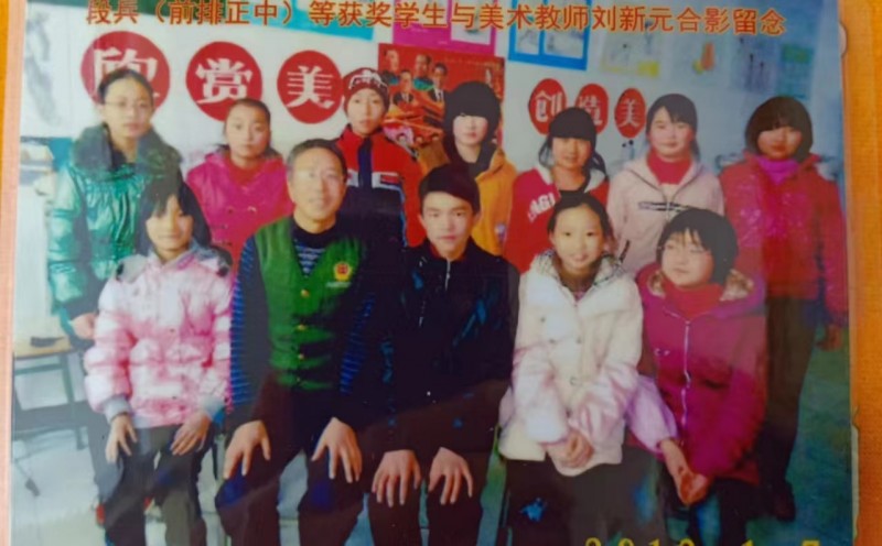 记者眼前有一幅2014年段兵等获奖中学生与美术教师刘新元的合影。神池二中美术教师刘新元说:“段兵,是我代美课时教过的学生,他与众不同,才华出众。他上美术课时很认真,很专心,作业做的快又好,作品看后让人赏心悦目!今天听到我的学生办起自己的美术馆,更觉欣慰!”