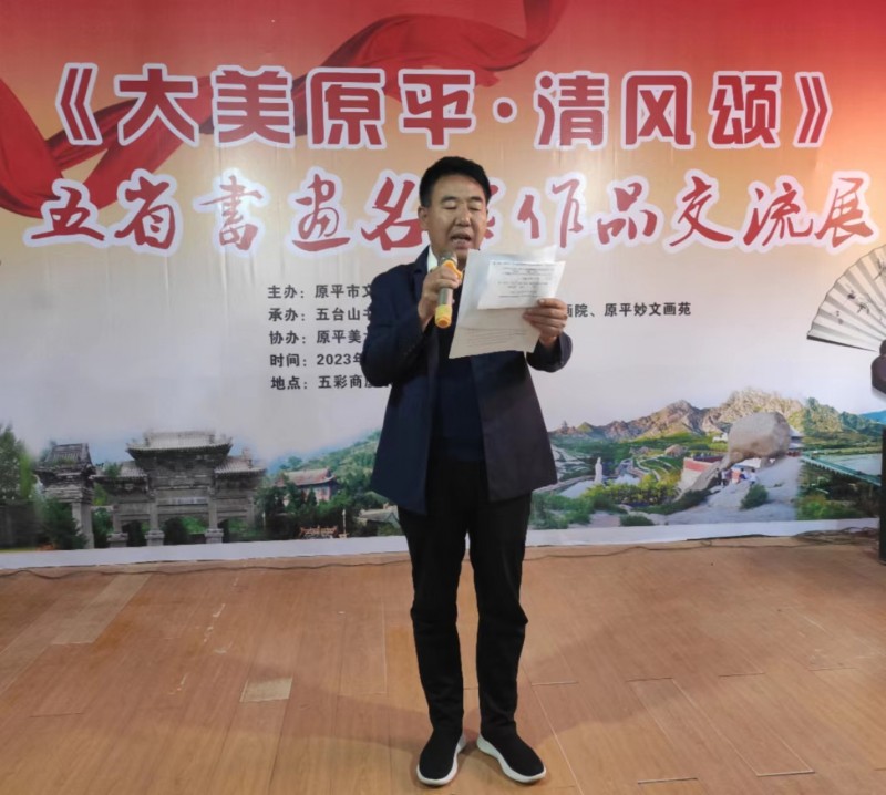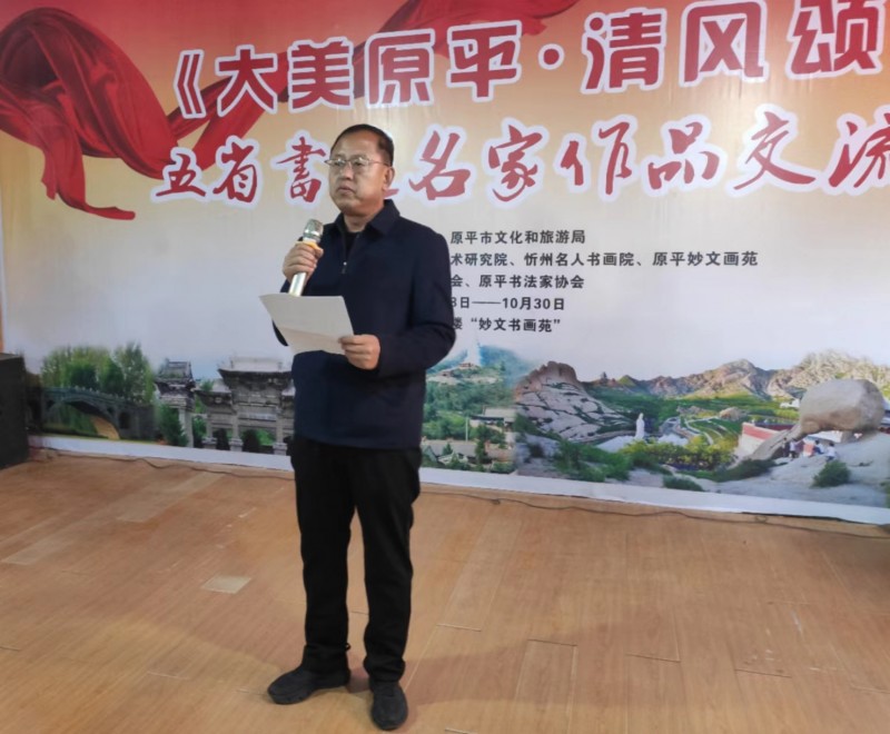 浓墨重彩抒发时代深刻新内涵,书画作品渲染乡村振兴新成就。10月28日至30日,由山西省原平市文联、原平市文化和旅游局共同主办,五台山书画艺术研究院、忻州名人书画院、原平妙文书画苑共同承办,原平美术家协会、原平书法家协会协办的主题为《大美原平·清风颂》的书画名家作品交流展在原平妙文书画苑隆重举行,来自北京,山西,陕西,河北,甘肃等地的10余名书画名家挥毫泼墨,翰墨颂党恩,丹青寄乡情,弘扬书画文化。此举不仅为全市乡村振兴泼墨添彩,而且给市民呈现精美文化大餐。原平市文化旅游局局长刘海云,市文联主席张海亮出席致辞,相关书画研究院、协会负责人,媒体记者,群众代表等2百余人参加,为期3天,来自各地的百幅书画精品交流展出,引人注目,圆满成功。